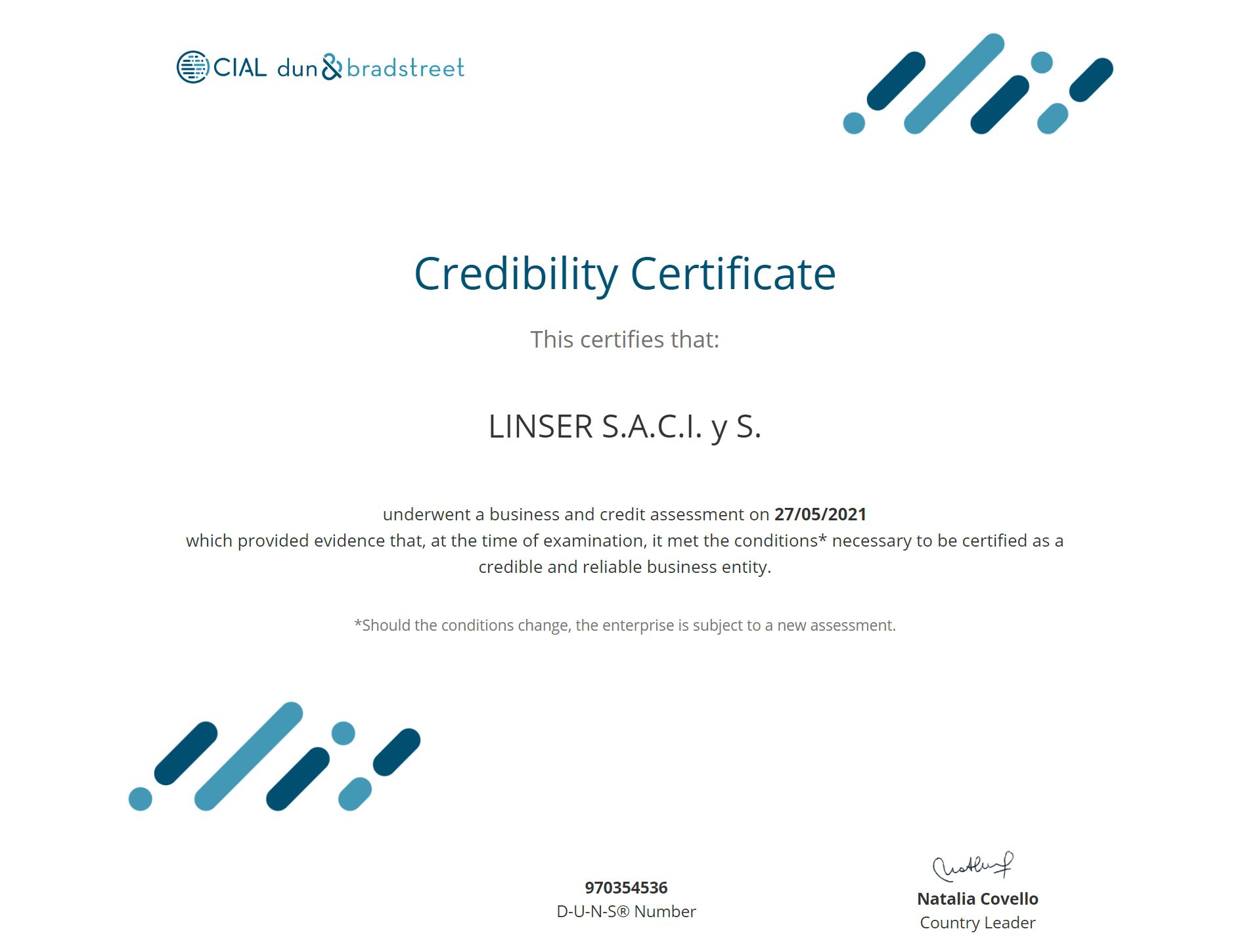 Linser cuenta con el documento legítimo, impreso, con un número de serie especial y único que le ha otorgado CIAL Dun & Bradstreet.